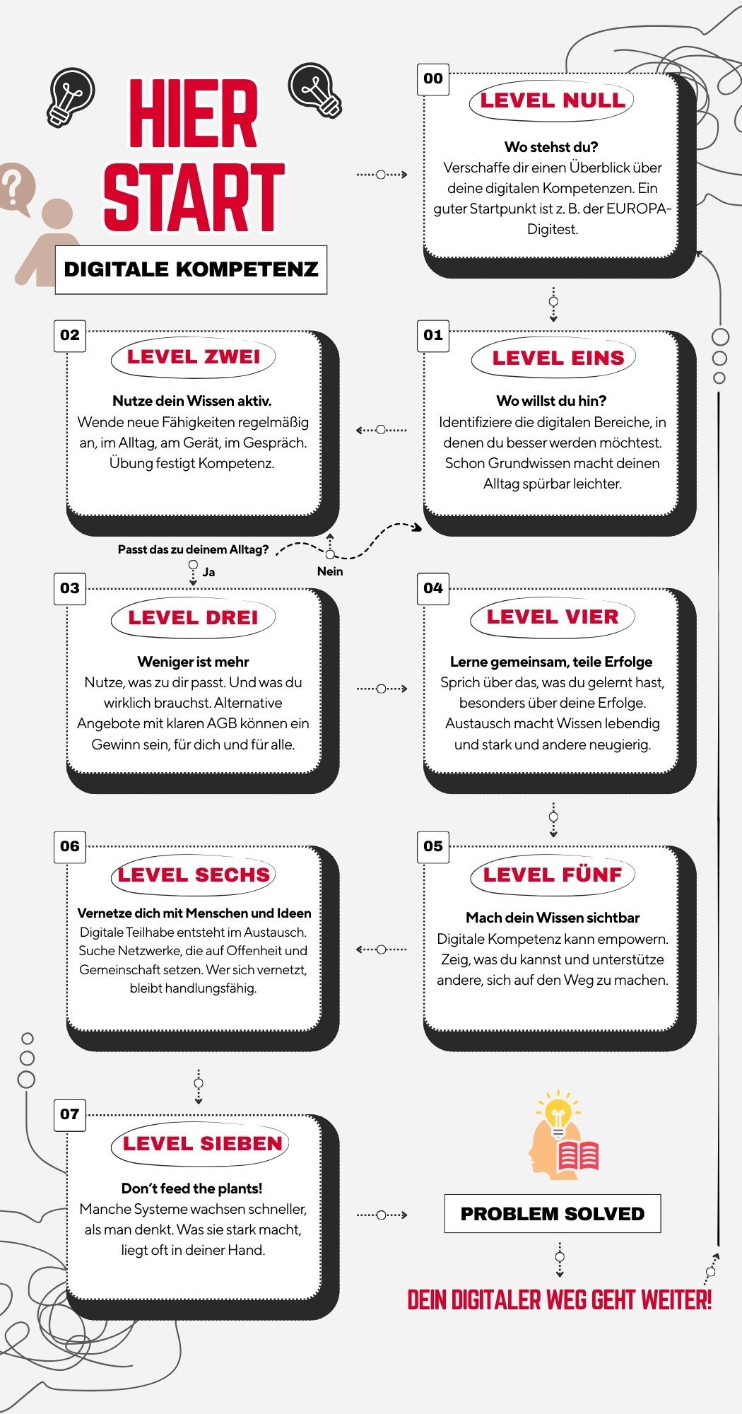 Digitale Kompetenz zu entwickeln bedeutet, mehr Sicherheit im Umgang mit Technik zu gewinnen. Wer besser versteht, wie digitale Werkzeuge funktionieren, kann informierter entscheiden, souveräner handeln und aktiver am gesellschaftlichen Leben teilnehmen. Es geht nicht darum, Expert:in zu werden, sondern darum, im digitalen Alltag sicher und handlungsfähig zu sein.